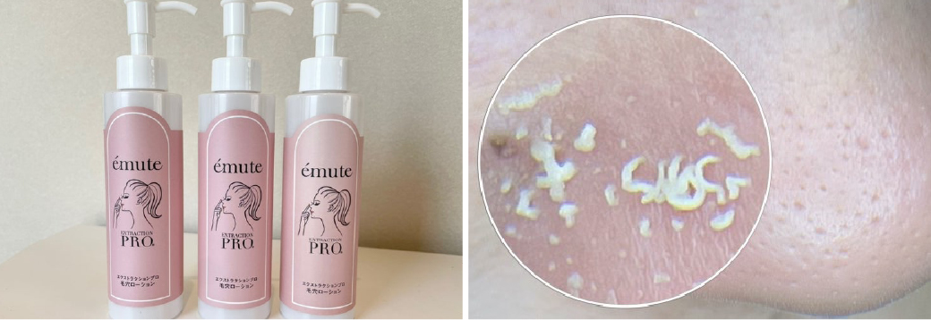 当校は、毛穴エクストラクションプロ®を安全に低刺激で行うために専用の毛穴洗浄ローション「エミューテ」を独自開発。エクストラクションローションで起こりうる症状を最小限にすることに成功しました。