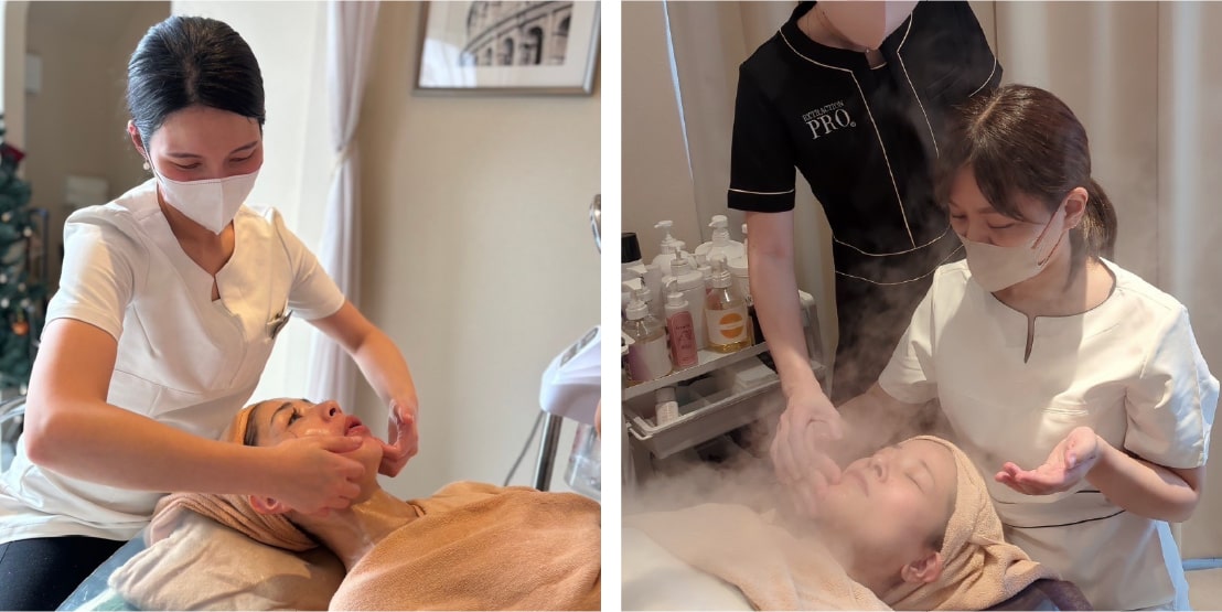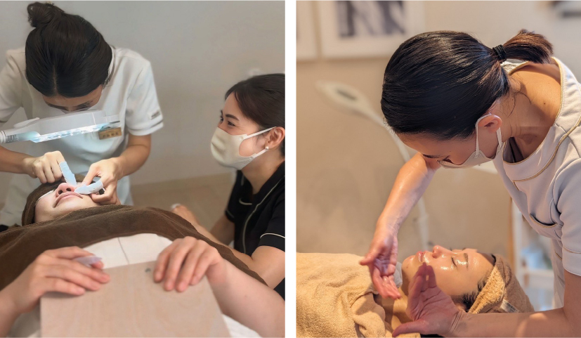 通常別講座の対面講習で受けるフェイシャル基礎テクニックの内容を、この講座では「対面」とオンライン動画の両方を使って学べます。エステ初心者の方ほど、動画だけでなく対面での指導もあってよかったというお声をいただいております。