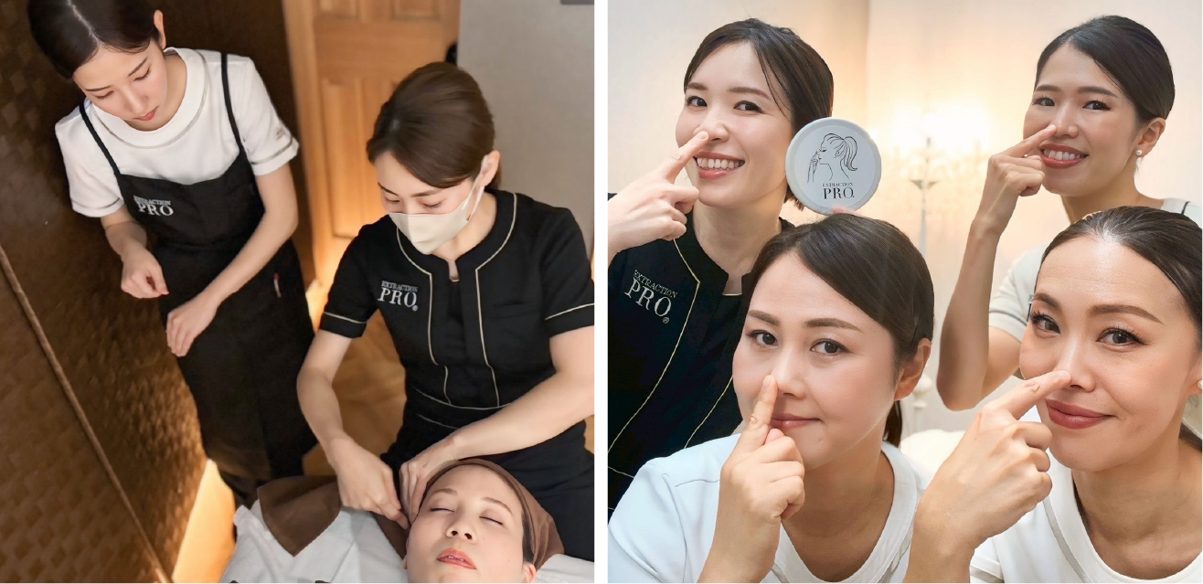 毛穴エクストラクションプロ®技術だけでなく、クレンジング、スポンジ、ホットタオル、タオルターバンの巻き方、タオルワークまで指導します。