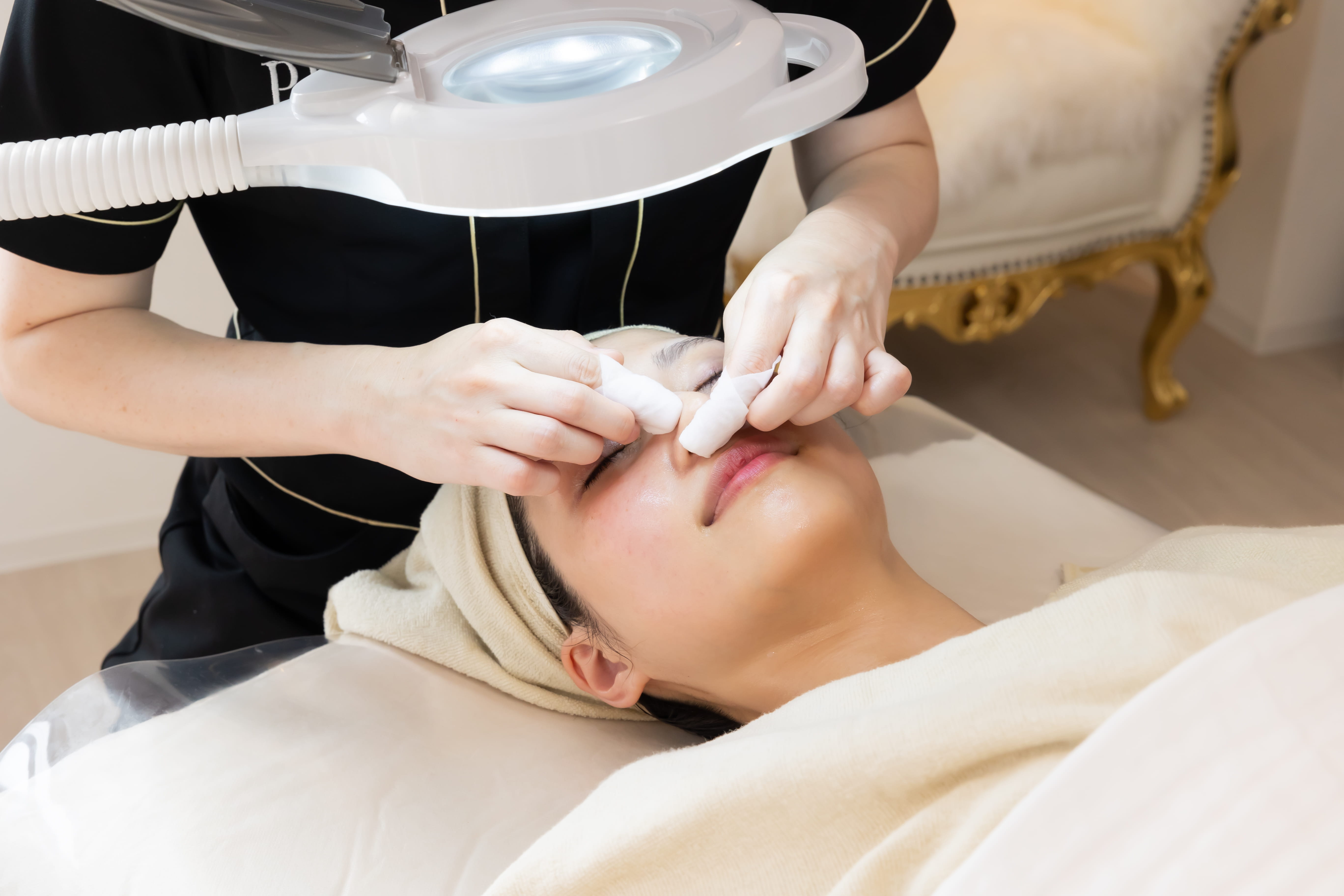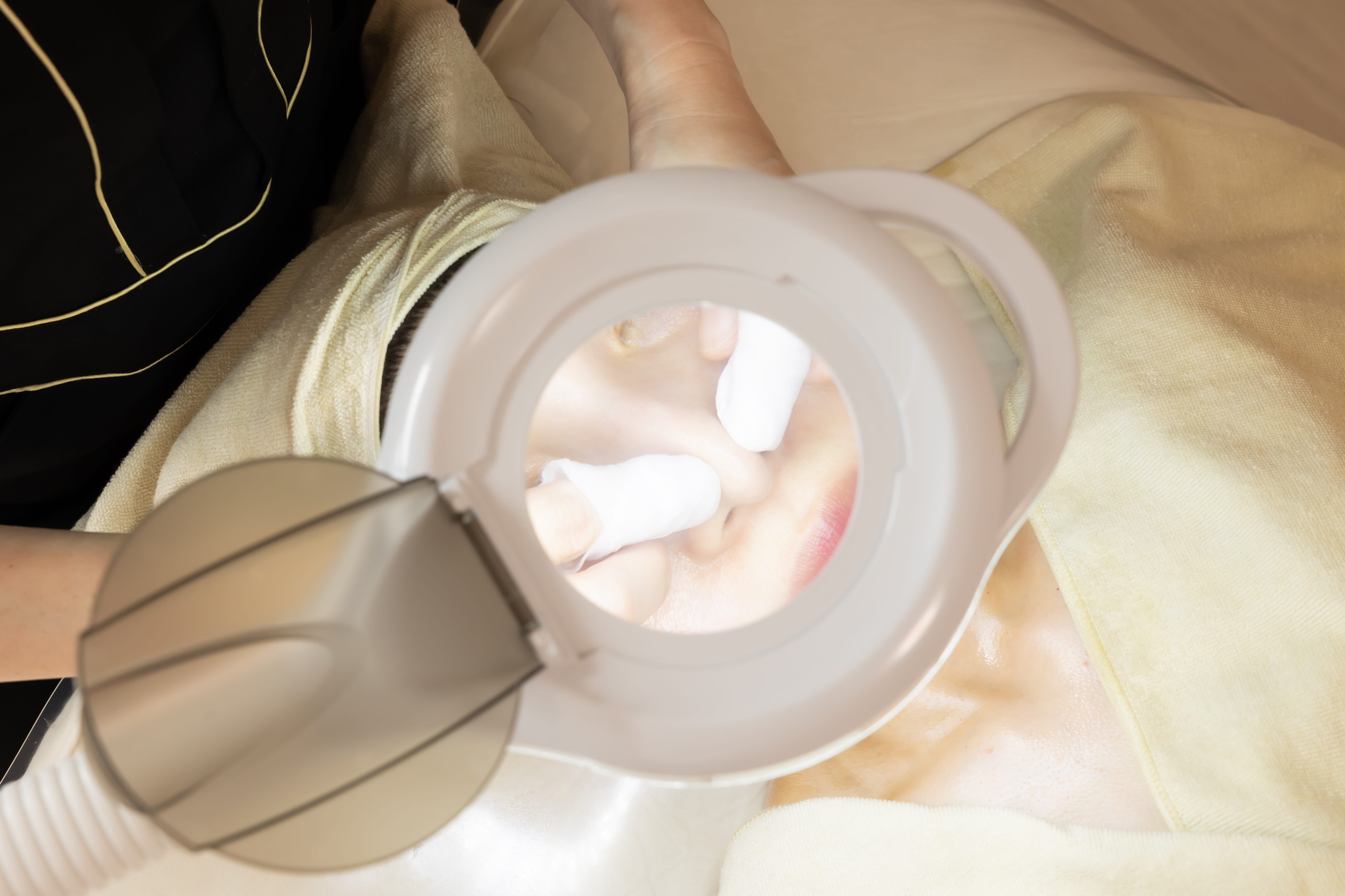 角栓・皮脂汚れを柔らかくした後に、拡大鏡を使用し、